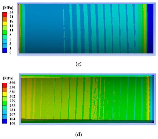 Figure 13a shows the variation in the maximum von-Mises stress on the sleeve in relation to the design variables during the untightening process. It should be noted that the allowable stress limit of 490 MPa was determined using a lower SF of 1.43 compared to the tightening process because the load is locally applied only to the oil passage during the untightening process. For the identical oil passage length, reducing the pitch leads to a decrease in the stress applied to the sleeve. Similarly, when the pitch remains constant, increasing the oil passage length ensures structural integrity, although the pitch has a relatively greater effect than the oil passage length. Consequently, decreasing the pitch and increasing the length of the oil passage result in a larger total passage area, which allows the untightening process to be performed at a lower hydraulic pressure and more smoothly. Based on the analysis results, a pitch of 10 mm and an oil passage length of 158 mm were chosen as the optimal design conditions for the oil passage, which can enhance workability without exceeding the allowable stress level. Figure 13b,c show the von-Mises stress distribution on the bolt and sleeve, respectively, under the selected design conditions. It is evident that the structural integrity of the designed hydraulic coupling bolt is secured during the untightening process by comparing the von-Mises stress distribution with the allowable stress limit.