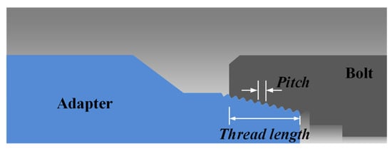 The adapter, which is directly coupled with the bolt, is a critical component that applies a tensile force corresponding to the applied hydraulic pressure to the bolt. Moreover, it is the most frequently damaged part during the tightening process in industrial applications. Therefore, the structural integrity of the adapter was evaluated according to the design variables. First, among the factors influencing the structural strength of the adapter, the thread length and the pitch were selected as design variables, as depicted in Figure 8. Table 3 displays the values corresponding to each level of the chosen design variables. In addition, the upper limit of the thread length was determined based on the minimum allowable minor diameter of the adapter tip calculated using Equation (12) below. Finally, as shown in Table 4, a two-way table was created according to the combination of design variables, and FE analysis was performed based on this matrix.