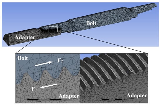 The selected design variables above are related to the thread shape of the adapter. Analysis of the integrity of a thread shape generally requires an FE model with a large number of elements, which can be computationally time-consuming. Therefore, unlike the analysis of the previous tightening process, we focused solely on modeling the adapter and bolt, omitting the analysis of nonlinear contact between the bolt and sleeve and between the sleeve and coupling, which are not important for the current analysis. Accordingly, a linear static analysis was performed, applying the second tightening load (F2) that induces the maximum stress on the bolt and adapter in the axial direction. Figure 9 displays the 3D FE model, which consisted of approximately 200,000 tetrahedral 4-node elements and 300,000 nodes. A full integration scheme was consistently applied to the elements, necessitating approximately three minutes of computational time for each simulation. A finer mesh was employed on the contact surface of the threaded part of the bolt and adapter to enhance the accuracy of the analysis [26]. The friction coefficient was applied as 0.2 for conservative design by referring to the results of previous studies [27,28].
