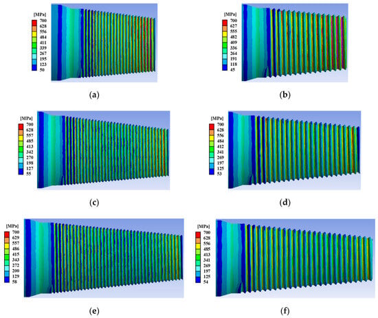 von-Mises stress distribution according to the design variables: (a) pitch 2 mm, thread length 61 mm; (b) pitch 3 mm, thread length 61 mm; (c) pitch 2 mm, thread length 76 mm; (d) pitch 3 mm, thread length 76 mm; (e) pitch 2 mm, thread length 91 mm; (f) pitch 3 mm, thread length 91 mm.