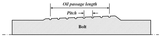 During untightening, oil flows between the bolt and the sleeve through the passage to generate hydraulic pressure, resulting in both an axial force pushing the bolt against the originally inserting direction and a radial force simultaneously expanding the sleeve. Hence, the shape of the oil passage is a key design parameter that influences the structural strength of the bolt and sleeve during the untightening process [18]. In industrial situations, the hydraulic coupling bolts frequently become stuck within the sleeve during disassembly. This leads to maintenance delays, necessitates extra steps to forcibly separate the coupling bolts, and can result in damage to both the bolts and sleeves due to excessive external loads. Therefore, this study simulated the untightening process of the hydraulic coupling bolt through FE analysis under actual operating pressure, aiming to identify the optimal shape for the oil passage to ensure structural integrity and confirm the sound operation of the process. As depicted in Figure 11, the pitch and oil passage length were selected as design variables. Table 5 presents the values of design variables at each level, and Table 6 is a two-way table for which FE analysis was performed.