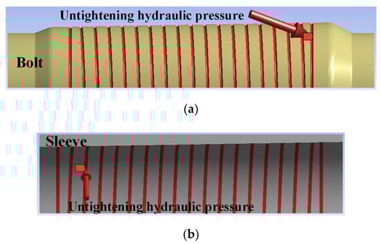 In the FE analysis of the untightening process, we used the results of the tightening process conducted in the previous section. As shown in Figure 12, the untightening hydraulic pressure was applied to the oil passage on both the bolt surface and inner surface of the sleeve after tightening. The analysis of the untightening process consists of two steps. Step 1 involves the release of the originally applied tensile force on the bolt, and in Step 2, hydraulic pressure is applied to the oil passage. The untightening hydraulic pressure in the second step was set to be the same as the operating pressure of the tensioner applied to the second tightening process. Throughout the analysis, a boundary condition was imposed by constraining the displacement in the direction perpendicular to the longitudinal plane using the symmetry condition for the quarter model. In the case of the coupling, directions other than the radial direction were also constrained. As in the tightening process, nonlinear analysis was performed due to contact nonlinearity between the bolt and the sleeve and between the sleeve and the coupling. Because the separation between the bolt and the sleeve leads to the divergence of the solution in static analysis, the sub-step function was used, and simulation results at the beginning of the separation were analyzed.