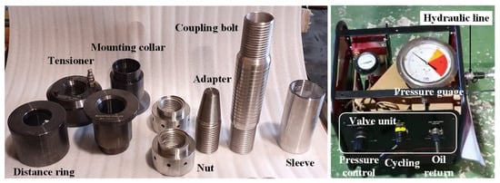To verify the results of the design and structural analysis of coupling bolts performed in this study, prototypes of coupling bolts were fabricated, and tightening and untightening experiments were conducted. Figure 14 shows all the components of the coupling bolt with the M72 specification and the hydraulic pump manufactured for the experiment. The material of the bolt and sleeve was SNCM439. Before conducting the experiment, a thorough examination of the bolt and sleeve was carried out to identify any potential flaws using liquid penetrant testing by the Korea Testing and Research Institute. The entire test procedure, equipment calibration, and repeatability were meticulously overseen and validated by the Research Institute of Medium and Small Shipbuilding.