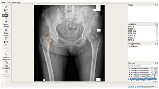 In this study, X-ray images of each of the four areas of the patient’s hip (femoral neck, greater trochanter, Ward’s triangle, and total hip) were separated and manually labeled using Labelme, an open-source tool that can be used for labeling [29]. The four parts of the hip were then framed as shown in Figure 2 below, and the labeled image data were batch converted into binary png files, which were used as inputs for the supervised learning training of U-Net, U-Net++, and image categorization in the image segmentation process.