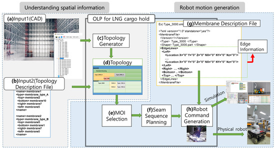 The software comprises two primary components: one that processes spatial information related to the LNG cargo window, and the other that generates robot movements based on identified topology information. The overall architecture of the software is depicted in Figure 4. There are two methods for determining the spatial information of the LNG cargo window: extracting topology information between membranes that form the window from CAD files, or receiving input in the form of a self-generated Topology Description File (TDF). If the input is in the form of CAD, the topology generator simultaneously generates TDF files and internal memory space using the extracted topology information. These inputs are illustrated in Figure 4a,b.