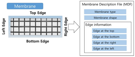 Figure 5 illustrates the topology of the LNG cargo window. The composition of the LNG cargo window comprises membranes, the topology of which is determined by specifying the names of the membranes located above, below, to the left, and to the right of each membrane. The Topology Definition File (TDF) lists the topology information of all membranes constituting the LNG cargo window, where the topology information of each membrane is expressed by the unique membrane names surrounding it in all directions. The first field of topology information, the membrane name, represents the unique name of the membrane, while the second field, the membrane type, indicates the type of membrane. The LNG cargo window has been created by combining various types of membranes.