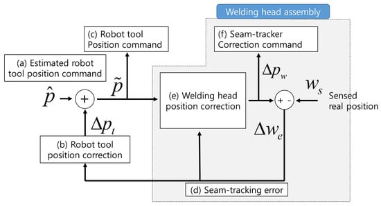However, in this study, the extensive workspace of the robot led to significant positional errors even with small rotational discrepancies at the end effector. To address this issue, seam-tracking errors were periodically monitored, and corrective measures were taken in the pose of the robot when there was a substantial positional error between the target welding line and the robot’s final end effector. Specifically, a dual-control routine structure was employed, as depicted in Figure 7, consisting of an external control routine with a low control cycle that corrects the position of the robot’s end effector. Simultaneously, a high-speed control routine is designed to govern the end-effector device of the welding head. The low-frequency external control routine, shown in Figure 7 as (a), (b), (d), generates a corrected end effector position command, , addressing the end effector position error without considering the welding head. Meanwhile, the high-speed control routine, composed of (d) and (e), generates real-time correction drive commands  for the seam-tracker.  represents the sensing values recognized by the commercial seam tracker.