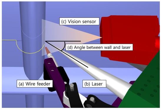 Owing to the high curvature of the corrugations, the robot faces challenges in maintaining a constant speed along the path, and there is a possibility of collision owing to the size of the laser-welding head. Adapting to changes in the robot’s path profile requires complex and crucial adjustments to parameters, such as the wire feed rate and laser intensity. Figure 8 illustrates the configuration of the robot end effector device welding the corrugations of the membrane, consisting of (a) wire feeder, (b) laser, and (c) vision sensor. The angle (d) formed between the robot end effector and the membrane wall at the beginning and end of the corrugation decreases as the corrugation progresses, increasing the likelihood of collision with (c) the vision sensor and wall. (b) The laser was depicted as a conical object in the simulation. In an ideal scenario, the laser achieves the highest welding quality when perpendicular to the seam, considering that the laser in the development is simulated as an idealized cone-shaped object.