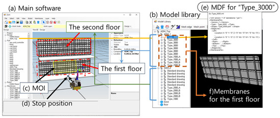 The developed software verified the understanding of spatial information in the LNG cargo hold composed of membranes, as shown in Figure 5. The analysis focused on a two-tiered wall, as depicted in Figure 9, with each tier constructed with various membranes, as illustrated in Figure 10. The ‘(a) Main software’ in Figure 9 visualizes the loaded environment and internally maintains separate models for the environment and the robot. The ‘(b) Model library’ shown in Figure 9 recognizes the membranes composing the entire two-tiered environment model, as displayed in (f). It separates and identifies each tier, lists the membranes comprising each tier, and allows inspection of the MDF for an individual membrane, as shown in (e). The robot model employs a laser-weldable model with a maximum reach of 1808 mm and, consequently, the MOI at the defined stop position (d) is understood, as depicted in (c). Specifically, it corresponds to the red portion in Figure 10. To enhance the quality of laser welding, membranes capable of simultaneous welding operations were set as MOIs, and only five membranes within the dashed area were included, as indicated for optimization.