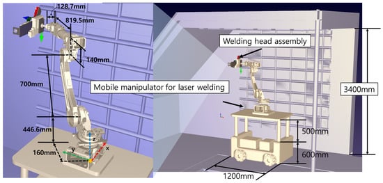 The robot model features a mobile robot with a 6-DOF manipulator mounted on top. To secure the workspace both above and below, a vertical movement axis was added to the mobile robot. The mobile robot has dimensions of 1200 mm in width and 600 mm in height, and an additional vertical stroke of 500 mm. The manipulator used for welding is the same as that described in Section 4.1, with a maximum reach of 1808 mm. While the actual model is an industrial robot with a payload capacity of 35 kg, the payload is irrelevant in the simulation because the dynamics are not considered.