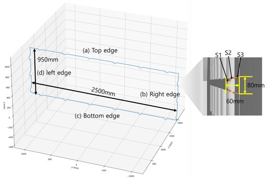 The membranes targeted for welding by the robot are shown in Figure 12. The model has dimensions of 2500 mm in width and 950 mm in height, with six corrugations on the top and bottom edges and three on the right and left edges. As illustrated in Figure 12, the characteristic feature of the corrugation path is a symmetrical conical shape consisting of three sections, S1, S2, and S3, each with different curvatures. S1, S2, and S3 represent round shapes with various curvatures. Simulation confirms the ability to trace the path; however, actual robot motions considering welding quality through integration with the welding device need to be validated through process research on actual membranes. Although the detailed robot motions may differ through the study of laser welding processes, simulation-based seam tracking allows for macroscopic verification of robot and environment collisions and confirmation of robot motion range and speed during membrane welding considering corrugations.