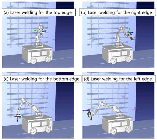 Through the preceding process, the target and sequence for robot welding were determined. However, the trajectory of the welding target seam was not considered in the previous steps, and it was addressed in the (h) robot command generation step shown in Figure 4. For the specific generation of robot trajectories, the development software defines the (e) Membrane Description File (MDF). Figure 6 illustrates the concept of MDF. MDF has the membrane type as the first field and the membrane shape as the second field. The membrane shape provides information about the CAD file for the 3D simulation. The most crucial part of MDF is the edge information section. Every membrane has top, bottom, left, and right edges; for each edge, the actual robot-assisted laser welding method is included in the edge information. Edge information can contain two types of data: the trajectory information of the edge for robot simulation and the robot command set for the actual welding operation. To achieve high-quality welding, the motion of the robot arm, synchronized laser intensity, and angles are crucial, as determined through the preliminary experiments. The welding method and procedure for all edges in all directions were predetermined based on the membrane type. The development program outputs the preset robot system operation in sequential order according to the determined seam-welding sequence in Figure 4f. In the simulation, the simulated robot follows the sequentially arranged robot trajectory, allowing confirmation of the robot’s movement and posture, but does not account for the welding quality.