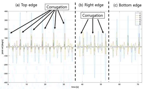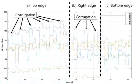 The simulation of the robot’s motion in welding the lowest membrane of the three is depicted in Figure 14. The sequence followed was the top, right, bottom, and left edges. As the membrane was positioned at a lower level, the vertical linear drive axis of the mobile robot was in its home position. The angles and angular velocities of the six joints of the manipulator are shown in Figure 15 and Figure 16, respectively. These figures confirm the suitability of the robot’s joint motion range and speed range for the intended task, when compared to the industrial robot intended for use. In particular, the corrugation section, which requires an extensive joint motion range and abrupt speed, falls within the normal operating range of the robot.