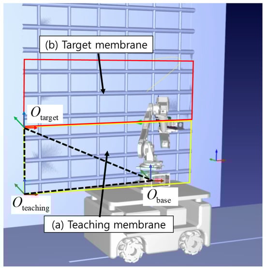 Let us denote the robot’s reference coordinate system as , the teaching membrane’s reference coordinate system as , and the target membrane’s reference coordinate system as . Each is depicted in Figure 17.