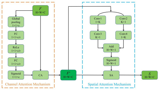 - The input features F′ are convolved by two convolution branches to obtain two spatial feature maps and . Every convolution branch has two convolutional layers, one with a kernel of 1 × k and the other with k × 1. This convolutional layer design can enlarge the acceptance domain without increasing the training parameters. The corresponding calculation can be given by Equations (4) and (5).where, and are 1 × 9 convolution, and are 9 × 1 convolution.