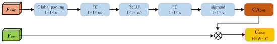 - is processed by the use of two FC operation to get the dependencies between individual channels. The process can be given by Equation (2).here, is used for dimensionality reduction and is used for dimensionality increase. denotes the scaling factor (set to 4 here), is the sigmoid function, and is the ReLU activation function.