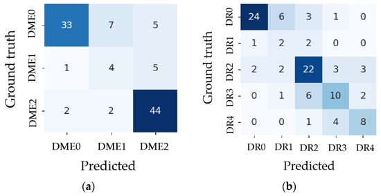- Due to the CFEN and ASPP module, the highest values of , DR , and DME are obtained. These results demonstrate that MaMNet can effectively extract the self-features, correlated features between DME and DR, and the global features of DR to enhance the grading performance.