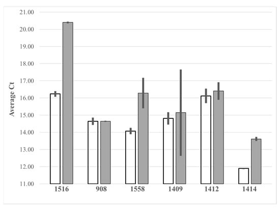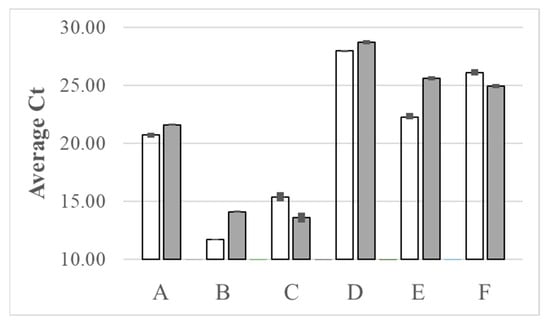 - Schmittgen, T.D.; Livak, K.J. Analyzing real-time PCR data by the comparative CT method. Nat. Protoc. 2008, 3, 1101–1108. [Google Scholar] [CrossRef]