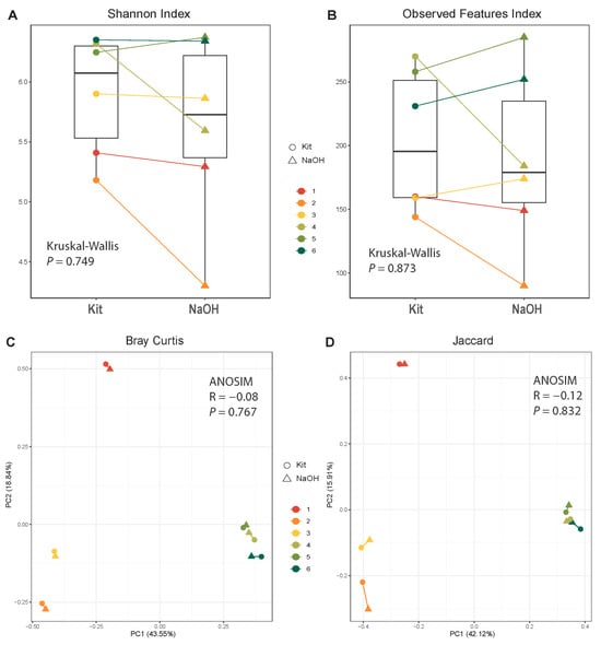 - Teng, F.; Darveekaran Nair, S.S.; Zhu, P.; Li, S.; Huang, S.; Li, X.; Xu, J.; Yang, F. Impact of DNA extraction method and targeted 16S-rRNA hypervariable region on oral microbiota profiling. Sci. Rep. 2018, 8, 16321. [Google Scholar] [CrossRef]