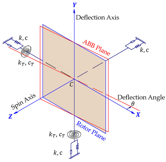 When the system operates as stable, due to the deflection of the orbital plane of ABB and the rotor plane, although the centrifugal forces acting on their respective planes both pass through the rotation axis, the intersection of each with the rotation axis is not necessarily the same, which may generate torques for the whole assembly system. In this paper, the spin axis (-axis) of the system is defined as the roll axis in a tri-axial system, and the pitch and yaw angles of the system should be considered for the phenomenon of torque. Therefore, in addition to the tri-axial isotropic linear spring k and viscous damper c, the elastic supports of the system should also consider the roles of the torsion spring and torsion damper in the other two axes except for the spin axis, as shown. The dynamic balance of this 3D model will be analyzed using spatial dynamics.