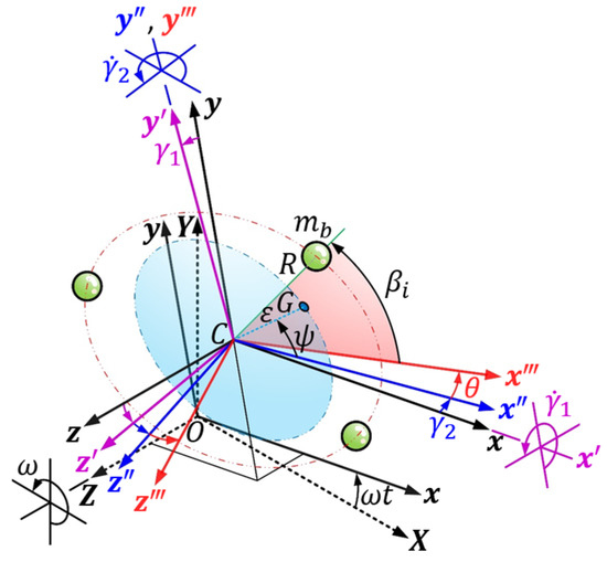 Additionally, , , and are the equilibrium pitch angle, equilibrium yaw angle, and balls’ equilibrium angular positions, respectively. From the definition of coordinate systems (Figure 2), the position vector of mass center of the rotor in as