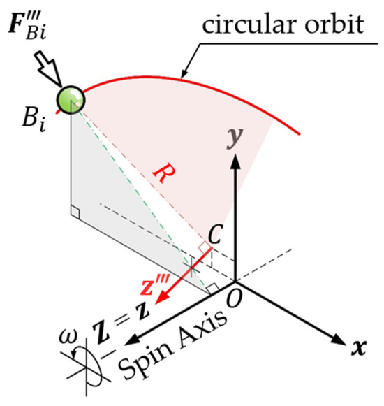 From the perspective of 3D dynamics, if the centripetal force of each ball can be decomposed into a component force in the tangential direction of the track, this component will cause the ball to move along the track direction. It can be seen from Equation (26) that the torque exerted by the centripetal force of each ball against the -axis perpendicular to the orbital plane is zero. It means that the centripetal force of each ball has no component in the tangential direction of the orbit and must pass through the -axis. As shown in Figure 4, when the system exhibits dynamic balance, the balls revolve around the spin axis (-axis) of the system with their respective stable and balanced radius at a constant angular velocity . At this time, the centripetal force acting on the ball by the system should be on the perpendicular line from the mass center of the ball to the spin axis. In other words, when the system is in dynamic balance, the centripetal force acting on each ball must be perpendicular to the spin axis and pass through the central axis of the ball orbit.