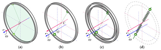 Discussed from the view of plane geometry, if one wants to make the perpendicular from the ball balance stationing point to the spin axis to intersect with the track center axis, as shown in Figure 6b, then the straight line passing through points O and C, which intersect the track at two points, can be both the possible and exclusive stationing positions for the balls. The phenomenon also applies to the ball positioning of ABB with multiple balls or multiple tracks or radial springs, as shown in Figure 6c,d.
