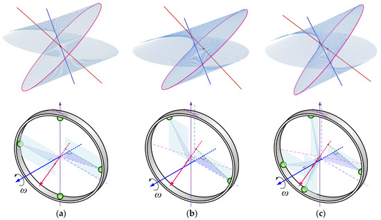 - If the spin axis does not pass through the track center, as long as the position of the track center () and its equilibrium angle can be determined, the intersections of the curved surface obtained by drawing perpendiculars to the spin axis at each point on the circumference of the track and the track center axis can be found. For two examples, (1) = 1, = −0.1, = 0.06 and = 25° and (2) = 1, = −0.05, = 0.05 and = 30° are shown in Figure 7b and Figure 7c, respectively, there may be two ( = −12.77° and = 111.87°) or four ( = −165.91°, = 102.58°, = −9.79° and = 98.28°) equilibrium positions of the balls.
