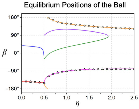 Under the conditions of system parameters = 5°, = 30°, = 3, = 0.2, = 0.1, = 0.2 and = = 0.1, the relationship between and the ball balance positioning numerically, as shown in Figure 8. The solid line is the solution obtained by satisfying the spatial-geometric relationship of the axis that is perpendicular to the balls and the track center axis. The part with η < 0.5 has two real solutions (and a pair of conjugate complex solutions). Starting from η ≥ 0.5, four real solutions appear, and as the value of gradually increases (about 1.93), two real solutions remain still. The hollow marked points in the figure are the ball balance positions obtained through numerical integration using the governing equation listed in [9]. It is worth noting that among the two equilibrium solutions in the η < 0.5 interval, only one is a stable solution, so the two balls gather together. When η = 0.5, although there are four equilibrium solutions, only one of them is stable. Two of the four equilibrium solutions in the interval 0.5 < η < 1.93 are stable. When η > 1.93, the only two equilibrium solutions are stable.