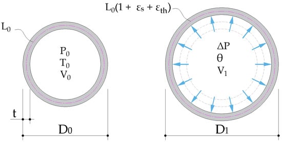 Figure 3. On the left, a tubular cross section is in the initial state. On the right, the same section is presented under changed conditions: the temperature of both the steel and the gas inside the inner space of the section has increased; because of the internal pressure, hoop stresses have been activated, causing axial stresses and strains (