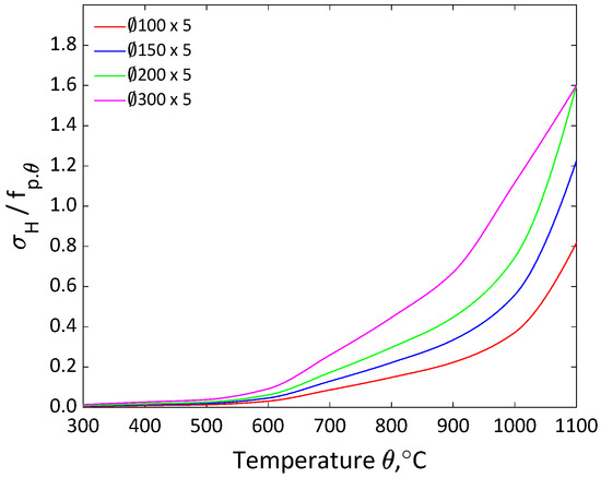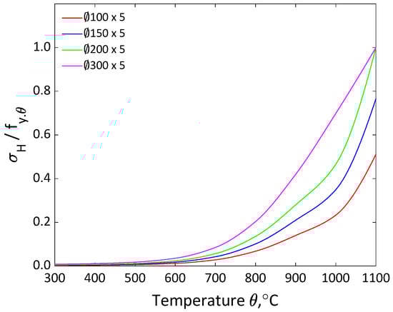 Figure 7. For sections of larger diameter, the hoop stresses reach the proportionality limit stress faster than for tubes of smaller diameter. For the Ø300 × 5 section at temperature 1000 °C, the hoop stresses start to approach the yield limit stress, which, according to the material model, implies a very large mechanical strain