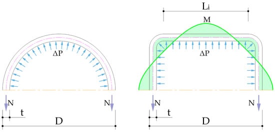 In the case of a circular section, the internal pressure causes only axial tension force in the section wall. In rectangular sections, the internal pressure also produces a bending moment (green line). In