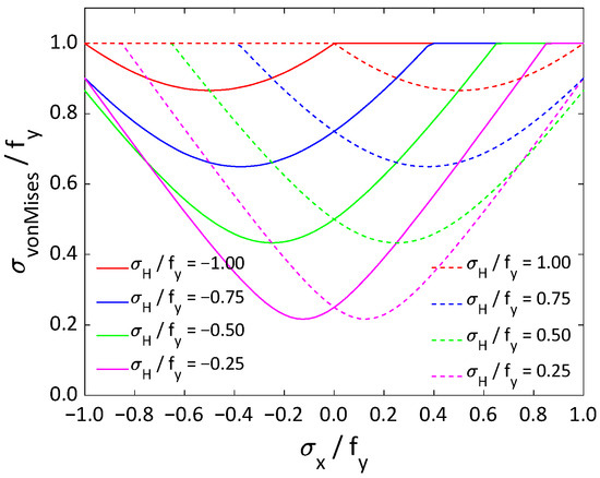 In that case that both σx and σH are of the same sign (both correspond to tension or compression), hoop stresses will delay the approach of the plastic state. For example, if σx = 1.00 fy and σH = 0.50 fy, then σvonMises = 0.90 fy. If σx and σH have the opposite sign, the situation is reversed—hoop stresses will intensify the approach of the plastic state. For example, if σx = 0.40 fy and σH = −0.75fy, then σvonMises = 1.00 fy. In the case of SHS, hoop stresses mainly result from the bending moment, which means that hoop stresses vary across the thickness from compression to tension. Consequently, no positive effect should be expected from the hoop stresses on the overall capacity of the SHS and RHS. A certain positive impact can appear for the CHS in tension.