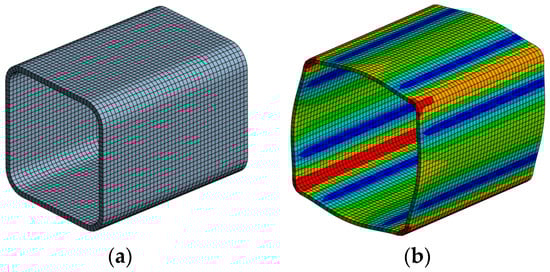 Simulations were performed using ANSYS 2023 R1 software implementing the “SHELL181” finite element types. The geometry of the model was rather simple, as shown in