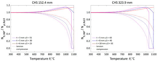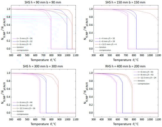 θmax is in the range between 580 °C and 1100 °C. For CHS profiles, the internal pressure increases tensile capacity, which is in line with the analysis SHS/RHS profiles, where internal pressure has a negative impact on both tensile and compression capacities. This was also predicted above and is explained by the bending moment emerging in components of SHS/RHS sections due to the internal pressure, while in CHS sections, the internal pressure produces only tensive force in the section wall. For SHS and RHS sections, the reduction in compressive axial capacity is more intense than that in the tensile capacity. Degradation is more intense for the SHS/RHS sections with larger
