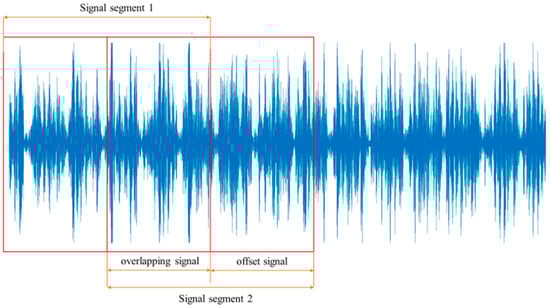 Since the signal is a long sequence signal and the data samples are too small, the signal must be processed by window function segmentation after the FFT transform. These windows usually have overlapping parts. Due to the boundary effect of the window function, this processing method will lead to the appearance of spectral leakage and sub-flap, which will affect the accuracy of the analysis results. To solve this problem, in this paper, the signal segmentation is performed by sliding window panning. By panning between each window, the overlap between windows can be reduced, thus minimizing the effects of spectral leakage and sub-flap, as shown in Figure 2. Assuming that the length of the original signal is N, the length of the window is M, and the step length (overlap rate) of the panning is L, after the panning, then, the length H of the signal obtained by window panning can be calculated as follows: