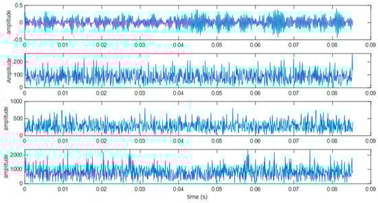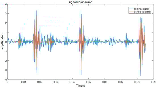 In Figure 6, the orange signal is the denoised signal and the blue signal is the original signal. The signal can be seen after soft threshold filtering removes most of the noise components in the signal while preserving the vibration frequency of the signal as well as the amplitude and other important features. In addition, wavelet threshold denoising smooths the signal, making the fluctuations of the signal smoother, resulting in the denoised signal compared to the original signal in some moments of the vibration amplitude being smaller, but on the whole, it can still reflect the vibration trend and changes to facilitate the identification of subsequent features.