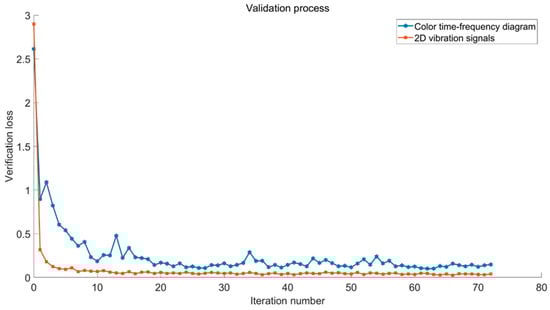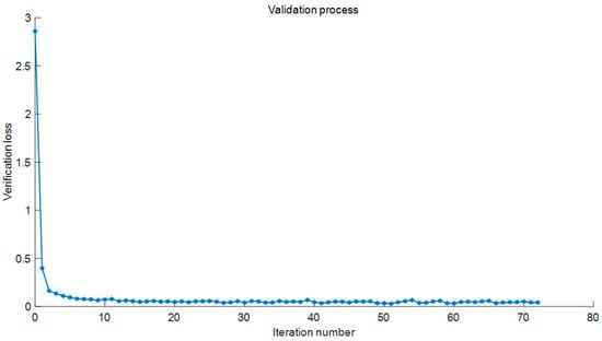The above processed signals are classified and numbered, and imported into the BOA-ResNet18 network for calculation, and the results show that the fault diagnosis accuracy of the color time–frequency diagram signals reaches 95.42%. This result proves that the BOA-ResNet18 network can achieve better accuracy and loss value with fewer iterations and a shorter running time under different fault data types, and the optimization of the network can be accomplished by continuously adjusting the parameters. The validation set obtained is shown in Figure 17 and Figure 18.
