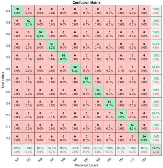 In Figure 15, the green squares indicate samples that are categorized accurately, i.e., the model correctly predicts the samples into that category, while the red squares indicate samples that are categorized incorrectly, i.e., the model incorrectly predicts the samples into other categories. It can be seen that the model predicts well. To explore the accuracy of the BOA-ResNet18 network for the calculation results of signals in other formats, and to avoid the possibility of the algorithm calculating a single sample, the denoised two-dimensional vibration signals were converted to three-channel color time–frequency plots by time–frequency analysis, as shown in Figure 16. In the color time-frequency diagram clearly depicts the relationship between the signal frequency over time and also expresses the corresponding amplitude magnitude by the change of different colors.