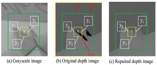 According to Figure 2, it can be observed that the depth values within the holes are strongly correlated with non-hole points distributed in the neighborhood of the holes. Additionally, since the holes in-depth images often appear in the edge regions of objects, utilizing a single-point calculation for repair weights cannot effectively distinguish between points situated at the object edges and those within the smooth interior regions of objects. This leads to a certain degree of computational error. The proposed algorithm addresses this issue by computing similarity weights using vectors centered around the points within the holes rather than relying on individual pixels. This approach enhances the robustness of the algorithm in handling hole repair, providing a more accurate and reliable solution.