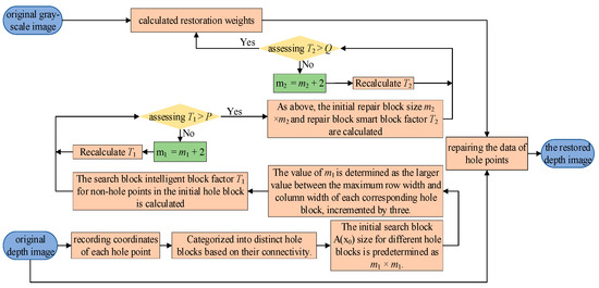 In response to the challenges present in the NLM hole repair algorithm, this section undertakes its enhancement and introduces a novel approach termed the adaptive block-based NLM hole repair algorithm. The detailed methodology is delineated as follows: The principle of the NLM hole repair algorithm based on adaptive blocks is shown in Figure 3.