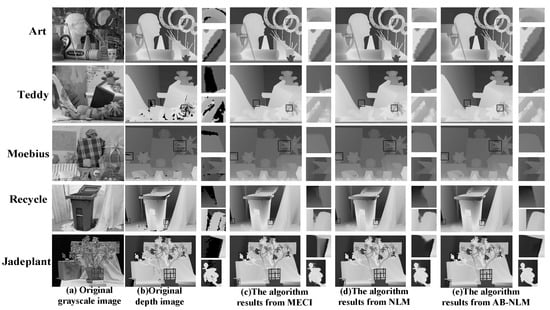 The proposed algorithm is applied to the Middlebury dataset, which contains the depth images of 2014 and 2021 and their corresponding grayscale images for depth recovery. Five scenes from the Middlebury dataset, namely “Art”, “Teddy”, “Moebius”, “Recycle”, and “Jadeplant”, are specifically selected to compare and evaluate the subjective quality of the restoration results.