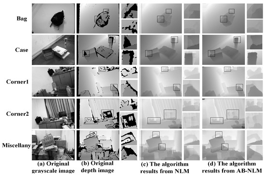 Considerable research efforts have been devoted by researchers both domestically and internationally to effectively fill the holes in-depth images and obtain high-quality depth images. CHO et al. [10] estimated the boundaries using color images and converged from the edges to the target boundary, effectively addressing holes between edges and multiple edge pixels to achieve seamless inpainting of object boundaries near the camera through an iterative process of alternating filling directions. Xiang et al. [11] extended Criminisi’s inpainting approach [12] by incorporating a block matching algorithm for identifying irregularly shaped voids and a hybrid matching algorithm for selecting optimal repair patches with minimal differences in hole regions, leading to successful restoration, particularly for larger irregular holes. Zhang et al. [13] introduced an object-oriented segmentation method to segment different objects in color images, locate source regions for repair patches, and utilize a search algorithm to match missing depth information regions with suitable objects, ultimately filling depth information gaps through optimal repair patch selection within the segmented objects. Zhang et al. [14] introduced the statistical nearest neighbors distance measurement (SNNDM) into the NLM filter (NLM-SNN) to measure the distance between two patches, thereby enhancing perceived image quality. Lin et al. [15] introduced a fixing algorithm for the Kinect depth image based on non-local means (NLM), utilizing weights calculated on the corresponding grayscale image through a distance factor and a value-consistency factor to fill holes in the depth image. These methodologies collectively leverage diverse strategies in hole repair techniques to effectively address challenges in in-depth image repair. However, the methods proposed in [10,11] are somewhat complex. The ultimate repair outcome in [13] is influenced by the effectiveness of image segmentation. Additionally, the method in [14] combines the statistical nearest neighbor distance measurement so that it is more complex. In contrast, the approach proposed by [15], inspired by [14], integrates distance factors to enhance restoration efficiency for Kinect cameras but encounters challenges in intricate parameter adjustments. Drawing inspiration from [15], this paper exploits the structural similarity between grayscale and depth images. It utilizes joint grayscale images to estimate depth values within hole regions and applies the non-local means algorithm [14,15,16,17,18,19,20,21] for effective hole repair. Successful restoration is achieved through the application of structural blocks and NLM-based hole filling.