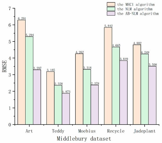 As shown in Figure 6, an in-depth analysis of the Root Mean Square Error (RMSE) for the MECI, NLM, and AB-NLM algorithms on various images reveals noteworthy observations. On the Art image, AB-NLM exhibits a significantly lower RMSE (3.297) compared to MECI (6.291) and NLM (5.294). Similarly, in the Teddy image, AB-NLM demonstrates superior performance, with an RMSE of 1.873, exhibiting a significant difference compared to NLM (2.358) and MECI (3.185). This trend persists across other images (Moebius, Recycle, and Jadeplant), showcasing the comparatively more accurate depth image restoration capabilities of AB-NLM.