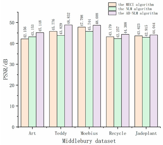 Displays a comparative analysis of PSNR results among the MECI, NLM, and AB-NLM algorithms based on the Middlebury dataset.