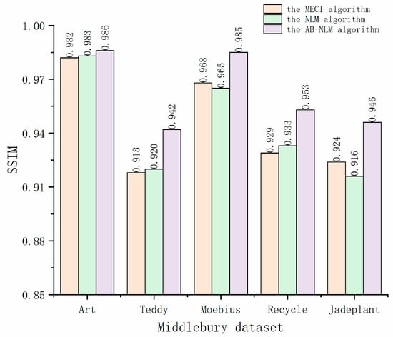 Displays a comparative analysis of SSIM results among the MECI, NLM, and AB-NLM algorithms based on the Middlebury dataset.
