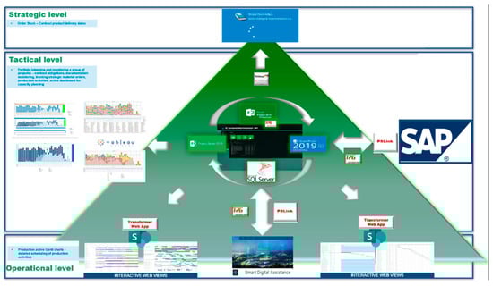 First, a lack of traceability was observed in the manufacturing process and a lack of information about how new orders would affect the existing production plan. The company needed a way to ensure that all project schedules would be adapted if an alteration was made to one project. It was emphasized that the production planning program must also be easy to use to shorten the existing employees’ learning curve. By dividing the architecture of the new integrated production planning system into three levels—strategic planning, tactical planning, and operational planning/workplace activity, the new Integrated Multilevel Planning Solution (IMPS) system was developed. The IMPS novel production planning system consists of seven components (DSA, SAP, Microsoft Project, Microsoft Project Server, TPG PSLink, TPG ProjectLink, Tableau, and Smart Digital Assistance) that are well connected and integrated into an existing design.