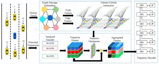 The multi-vehicle motion features are extracted via graph messaging embedding and the GAT is employed to describe the vehicle–vehicle spatial interaction relationships. In addition, these features are concatenated with temporal trajectory features via a self-attention mechanism to achieve spatio-temporal information aggregation.