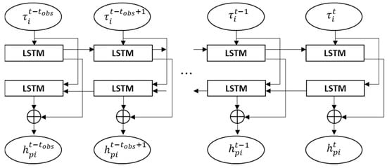 Equation (9) illustrates the vehicle motion features containing spatial vehicle–vehicle interactions. Due to the continuity of vehicle motion, such features at different sampling times are still temporally coupled. Thus, another LSTM network is utilized here to implement spatio-temporal feature fusion, denoted as
