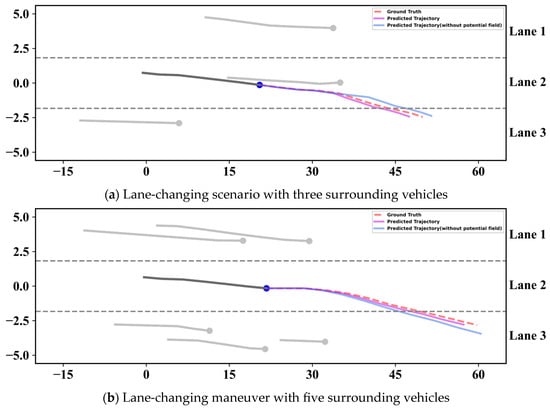 Figure 5 illustrates the prediction results for the lane-keeping maneuver. The gray and blue dots denote the surrounding vehicles and the target vehicle, respectively. The gray solid line is the historical trajectory of the target and surrounding vehicles. The pink dashed line is the future ground truth trajectory. The purple solid line is the predicted trajectory for the proposed model in this paper and the blue solid line is the predicted trajectory generated by the prediction model without the potential field module. Figure 5a is a congested traffic scenario. The vehicles are accelerating at a low initial speed. Note that there are six moving obstacles around the target vehicle. Although the speed of the front vehicle is slower and blocks the target vehicle, there are surrounding vehicles in both the left and right adjacent lanes, which move side-by-side with the target vehicle within the observation horizon. The free space for lane changing is insufficient. Therefore, both prediction models judge that the vehicle will sustain lane keeping. The model without a potential field module is not sensitive enough to predict the change in the vehicle speed, which leads to a relatively large final distance error (FDE). In contrast, our approach analyzes the collision threat of the front vehicle to the target vehicle more accurately, enabling a better FDE performance. In Figure 5b, the traffic flow is still congested but vehicles are moving steadily. During the observation horizon, no obvious acceleration, deceleration, or lane-changing maneuver occurs, meaning the safety of the object vehicle is not threatened. So, the vehicle trajectory prediction results are continual lane keeping for both prediction models. Similar to Figure 5a, the proposed algorithm predicts the future speed of the vehicle more accurately and the predicted trajectory is closer to the ground truth.